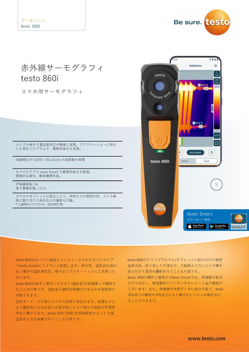 ◇ モバイル端末にインストールされたモバイルアプリtesto Smartにワイヤレス接続します。熱分布、温度計の届かない場所の温度測定等、様々なアプリケーションにご活⽤いただけます。