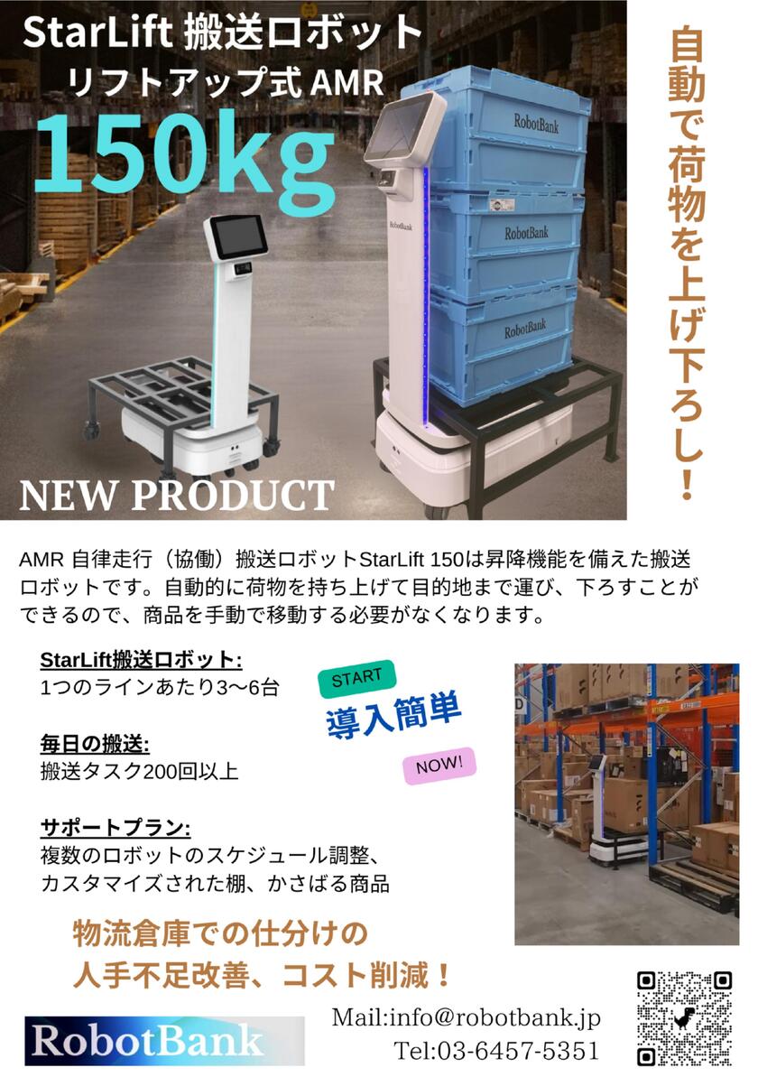 ◇ AMR 自律走行(協働)搬送ロボットStarLift 150は昇降機能を備えた搬送ロボットです。自動的に荷物を持ち上げて目的地まで運び、下ろすことができるので、商品を手動で移動する必要がなくなります。