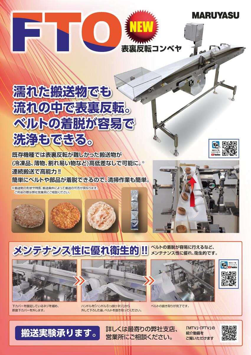 ◇ FTOは、搬送物を流れの中でスムーズに表裏を反転させる専用コンベヤです。従来機種では困難であった冷凍品、薄物、割れやすい製品なども、高低差を設けることなく確実に反転させることが可能です。これにより、連続搬送ラインにおいても高能力な処理を実現します。※