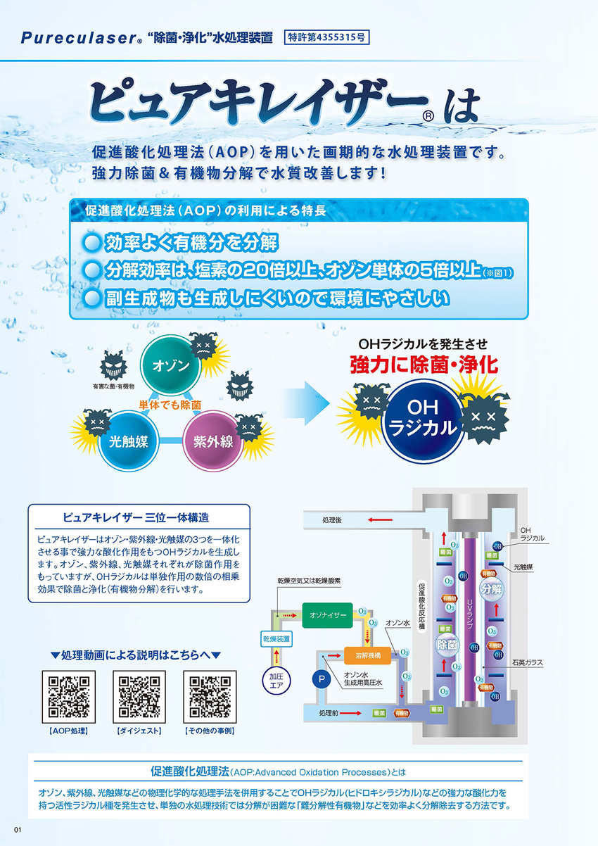 ◇ 促進酸化処理法(AOP)を用いた画期的な処理装置です。強力除菌&有機物分解で水質を改善します。
